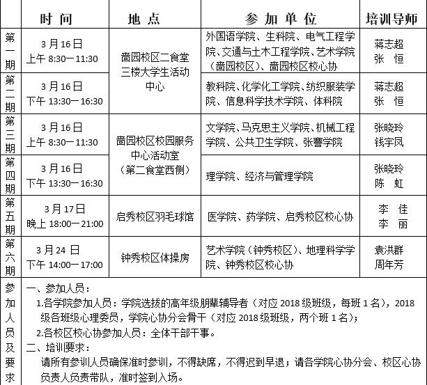 兹定于3月中下旬,分校区举办2018级第二学期《大学生心理素质教育》必修课程第二课堂班级团体成长活动朋辈辅导者培训。请各学院联系心理工作的辅导员通知相关学生干部准时参加,不得缺席。