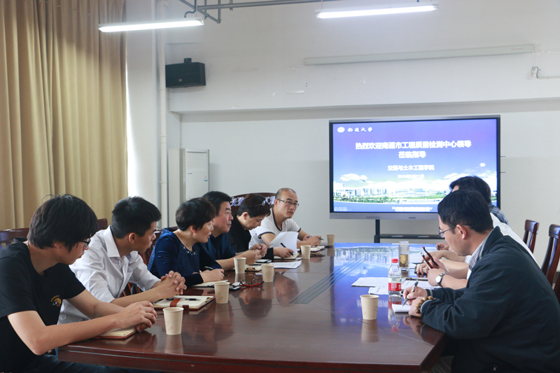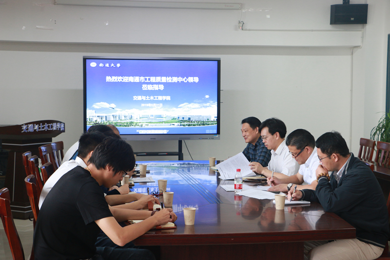5月31日上午,南通市建筑工程质量检测中心于榕庆主任一行来我院洽谈合作事宜,施佺院长、蒋泉副院长、成军教授出席会议。
