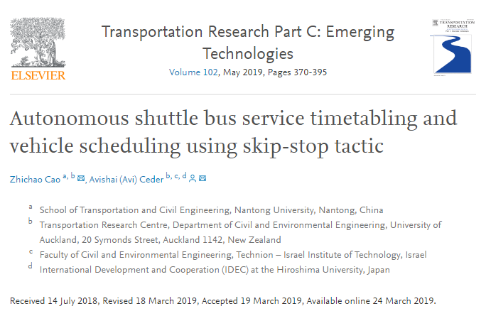 近期,我院交通运输系曹志超博士在TransportationResearch Part C上以第一作者、南通大学为第一单位发表学术论文“Autonomousshuttle bus service timetabling and vehicle scheduling using skip-stop tactic”,该文基于精细化客流需求,提出来自动化接驳公交的时刻表编制方法,通过跳停(stop-skip)作业实现公交车辆的调度优化。模型以客流出行时间最小化和车辆数(fleetsize)最小化为目标,考虑车辆载客能力,通过DF图论方法实现fleet size的对比,基于奥克兰公交系统的案例分析,证明所提模型可实现用户耗时减少1.83%,最大车底数减少8.11%。
