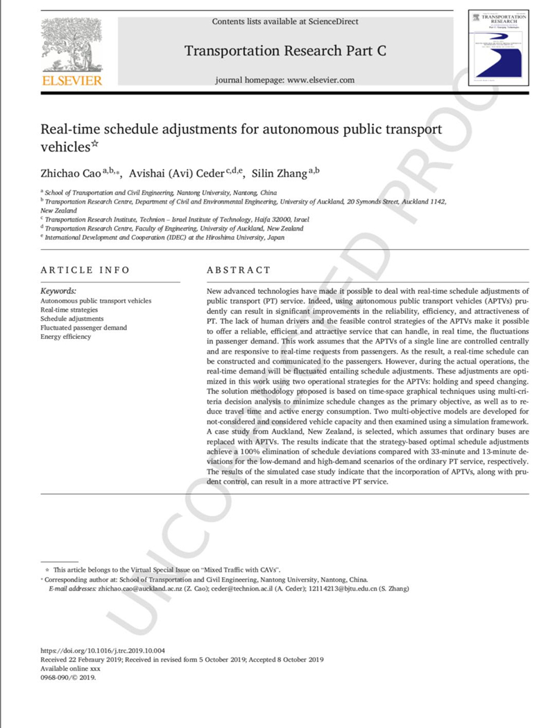 近日,yl23455永利集团交通运输系教师曹志超博士与Avi Ceder教授、张思林博士,在交通领域顶级Top期刊Transportation Research Part C上以第一作者、通讯作者、南通大学为第一单位发表题为《Real-time Schedule Adjustments for Autonomous Public Transport Vehicles(无人驾驶公交车的实时自动化控制)》的学术论文。