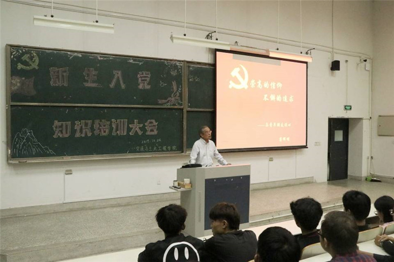 作为已入党54年的资深党员,蒋辉明讲述了中国共产党诞生的历史、先辈们的英雄事迹,表达了坚定信仰、肩负使命的深邃思想。他结合自身的求学经历与邓小平、邓稼先等爱国人士的生平经历,分别从使命感、爱国情、不懈追求三个方面重点阐述,强调了青年学子要时刻对党保持忠诚与拥护,强化了大家对党的信仰力量与不懈追求。他还围绕“努力践行党的宗旨,全心全意为人民服务”的话题,列举了周恩来、“莫文隋”等为人民奉献的典范,呼吁新生们要学做雷锋,彼此共勉。最后,蒋辉明向同学们介绍了入党申请流程,鼓励同学们要积极向党组织靠拢,早入成为中国共产党的一员,为实现中华民族伟大复兴的中国梦添砖加瓦。