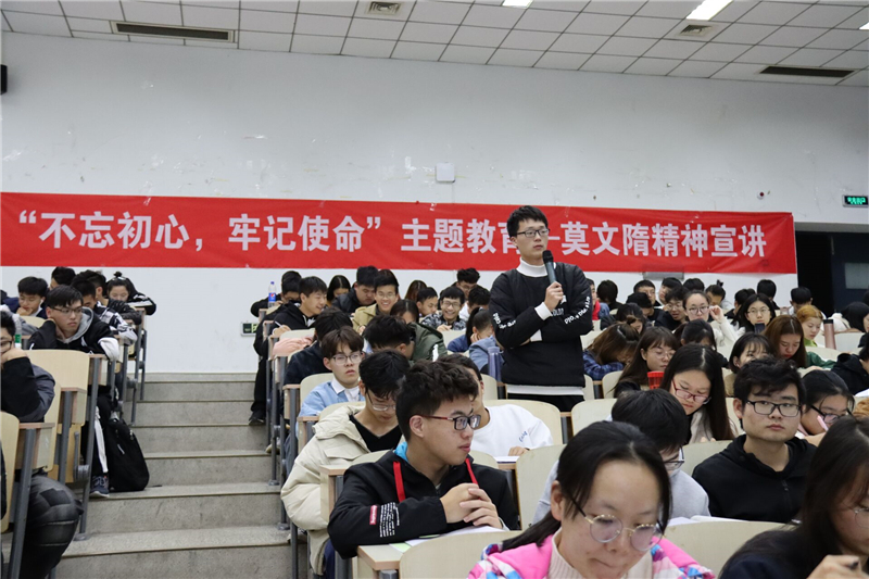 “莫文隋”精神不仅仅是一种奉献精神,更是一种通过帮助他人而自我成长与收获的过程。在观看了宣传视频《莫问我是谁》之后,大家感触良久,仿佛再现了二十多年前整个南通城寻找“莫文隋”的情景。在互动环节,在场的同学积极踊跃地表达了自己对“莫文隋”精神的诠释,以及表示今后该如何践行社会主义核心价值观和接力传承“莫文隋”大爱精神的决心,以实际行动不断彰显“莫文隋”精神的价值和力量,让爱汇聚江海奔腾不息。