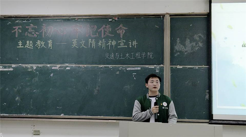 此次宣讲会分为交流分享、观看宣传视频、互动环节三个部分。我校第22届“莫文隋”研究生支教团成员、学院“莫文隋”精神宣讲团成员陈佳旭从“莫文隋”的起源、“莫文隋”精神的发展、“莫文隋”精神的传播和我们与“莫文隋”精神四个层面,向大家展示了“莫文隋”精神的悠久历史和发展历程。他讲述了“莫文隋”原型汤淳渊老先生生前的感人事迹,指出“莫文隋”并不只是一个人,而是一个不断壮大的群体,例如卫英才、叶中恭、吴铭等,他们虽没有惊天动地的豪言壮语,但却在用点滴行动不断传播着“莫文隋”精神,聚沙成塔,集腋成裘,使“莫文隋”精神成为永驻江海志愿者心中的一座精神丰碑。陈佳旭还着重介绍了学校“暖冬计划”和学院的“多背一公斤”志愿服务团队,他呼吁广大青年要积极响应党和共青团的号召,积极学习新思想,争做新青年,带着责任和爱再出发,做敢于追梦的通大人。