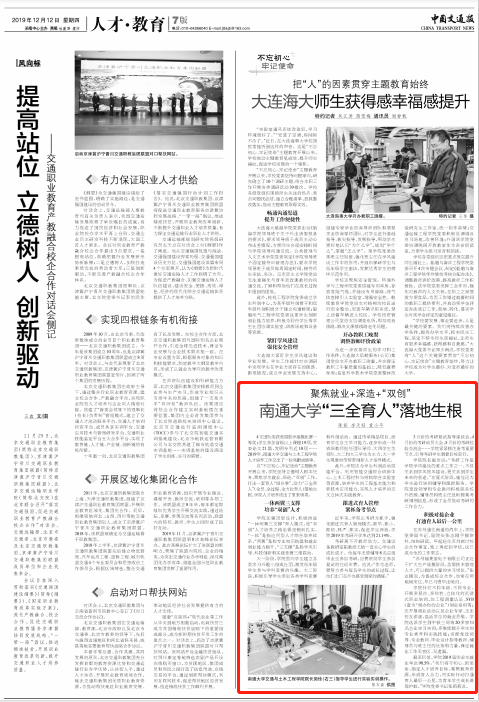 12月12日出版的《中国交通报》在第7版以《南通大学“三全育人”落地生根》为题,关注我院人才培养举措。