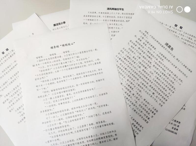 征集作品中,同学们以笔为矛,以语为盾,以微小说为创作形式,紧扣党风廉政建设和反腐败主题,聚焦社会现实生活的典型微案例、微片段、微场景,以独特的视角,以丰富的表现手法,以多维的思维范式,直面社会、校园种种腐败丑恶现象和廉洁行为,积极弘扬以廉为荣、以贪为耻的社会风气。有的以古论今,颂扬淡泊名利、修身养性、廉洁为民的勤政典型;有的以亲身经历,讲述了试图剽窃他人科研、荣誉等劳动成果的沽名钓誉行为;有的以疫情为背景,剖析了个别组织和个人借机发国难财的丑恶行为;有的以学校具体事例为素材,弘扬领导干部把握廉洁航标、坚守心灵标尺的廉洁精神。