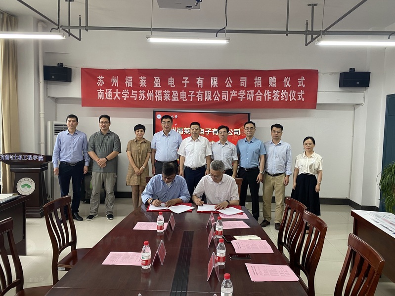 7月2日下午,我校举行苏州福莱盈电子有限公司捐赠仪式暨与南通大学产学研合作签约仪式。校党委常委、总会计师、教育发展基金会副理事长姜佩剑代表学校向苏州福莱盈电子有限公司董事长丁峰颁发捐赠证书、纪念牌和产学研合作铜牌。苏州福莱盈电子有限公司董事长丁峰分别与我校教育发展基金会秘书长岳泳签署捐赠协议、与我校yl23455永利集团院长施佺签订产学研全面合作协议和技术开发协议。
