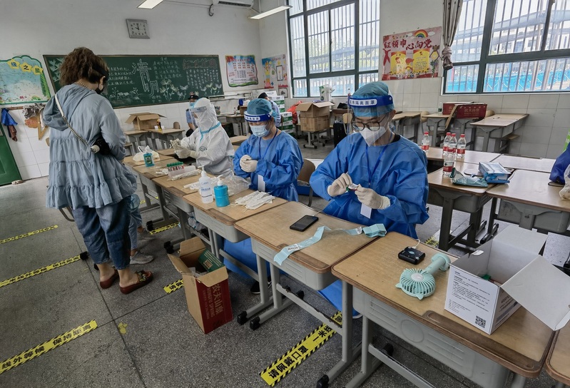 近日,在南京市江宁区江宁街道铜井中心小学核酸检测点内,yl23455永利集团土木工程203班李紫恒穿着防护服,和他母亲一同并肩作战在抗疫一线。李紫恒的母亲叶宣琴是社区工作人员,得知社区急需志愿者,李紫恒第一时间报名,每天与母亲一同奔赴岗位,和社区工作人员一起对辖区3000多名常住人口开展检测,常常忙到次日凌晨3点。