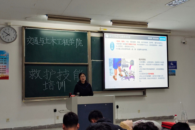 在宣讲会的最后,南通市红十字会老师以简单易懂的语言向同学们详细讲解了心肺复苏、人工呼吸等常见急症、意外伤害的救护原理及技术手段,同时演示了心肺复苏的步骤及AED的使用,并且安排同学现场操作心肺复苏。之后讲解了应对火灾、中暑、狂犬病等意外的急救。通过培训,同学们了解到在面对意外时应当沉着冷静应对,与生命赛跑中需要勇气智慧,只有正确地把握救护技能,才能赢得更多宝贵的生命。