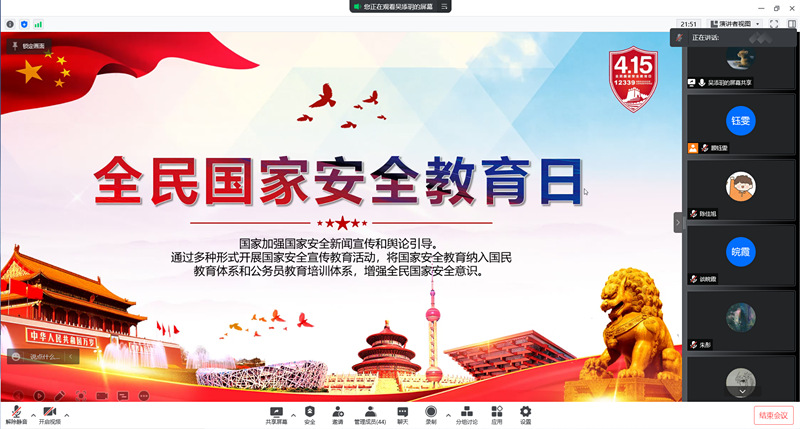 今年全民国家安全教育日的主题为:树牢总体国家安全观,感悟新时代国家安全成就,为迎接党的二十大胜利召开营造良好氛围。活动中,全体研究生一起观看了国家安全教育宣传片,研究生会副主席吴添玥从何为国家安全、当前国内国际形式、深入理解总体国家安全观以及如何维护国家四个方面,带领大家深入学习了国家安全的相关内容。