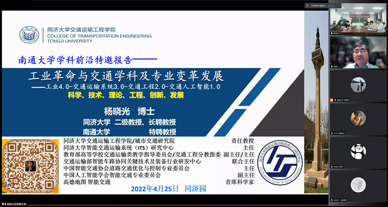 4月25日,教育部高等学校交通运输类专业教学指导委员会交通工程教学指导分委员会主任委员、同济大学二级教授、南通大学特聘教授杨晓光,应邀为yl23455永利集团师生在线做了题为“新工业革命与交通学科及专业变革发展”的学术报告。报告会由yl23455永利集团院长施佺主持。