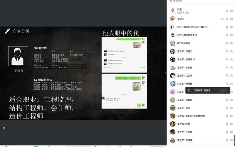 此次大赛以线上形式举行,经过层层筛选,共有10名同学进入决赛。决赛中,每位选手结合自身特点,逐一围绕自我评估、人格分析、职业认知、未来目标四个方面进行了精彩的ppt呈现。职业规划书均逻辑清晰、条理分明,不仅反映出个人理想与追求,还将自我规划与国家战略相结合,展现了新时代通大学子敢于创新的精神风貌,体现了当代大学生助力社会建设的责任与担当,同时也为大一大二的学弟学妹们树立了良好的榜样。经过激烈角逐,土木(3+4)201班王珂凡荣获一等奖,交通设备203班金磊和交通设备201班柴长义荣获二等奖。