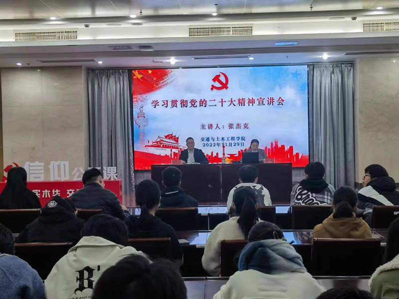 学院党委副书记、副院长陈妍主持报告会。她指出,报告既有理论高度,又联系具体实际,对同学们深入理解二十大报告的丰富内涵和精神实质具有很好的指导作用。针对学习贯彻党的二十大精神,她对全体学生党员提出三点要求:一是从思想上高度重视,深刻领会二十大报告的精髓要义;二是把思想和行动迅速统一到大会精神上来,坚定不移听党话、跟党走;三是充分发挥党员的先锋模范作用,更加坚定理想信念,苦练实干本领,以踔厉奋发、笃行不怠的精气神,投入到今后的学习和工作中。