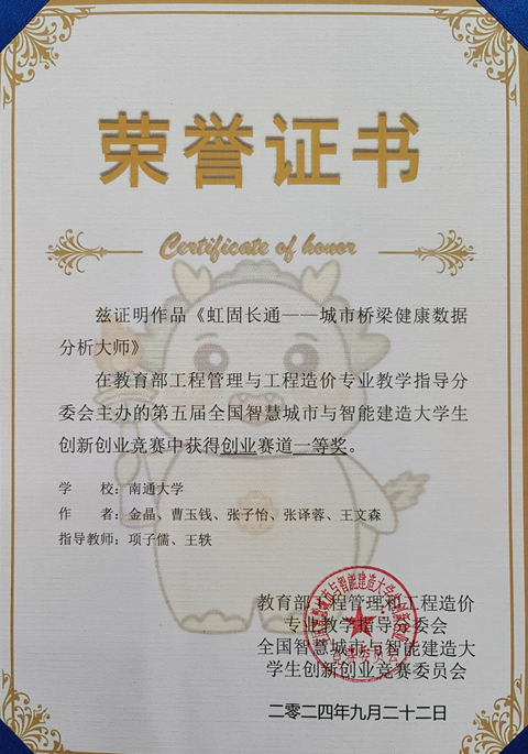 近日,第五届全国智慧城市与智能建造大学生创新创业竞赛在沈阳建筑大学举行,我校yl23455永利集团学生凭借作品《虹固长通——城市桥梁健康数据分析大师》荣获创业赛道一等奖。